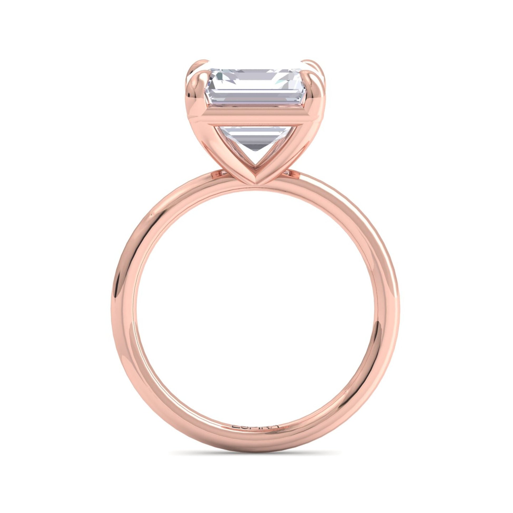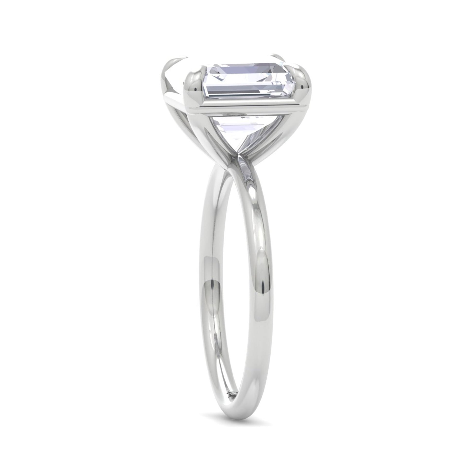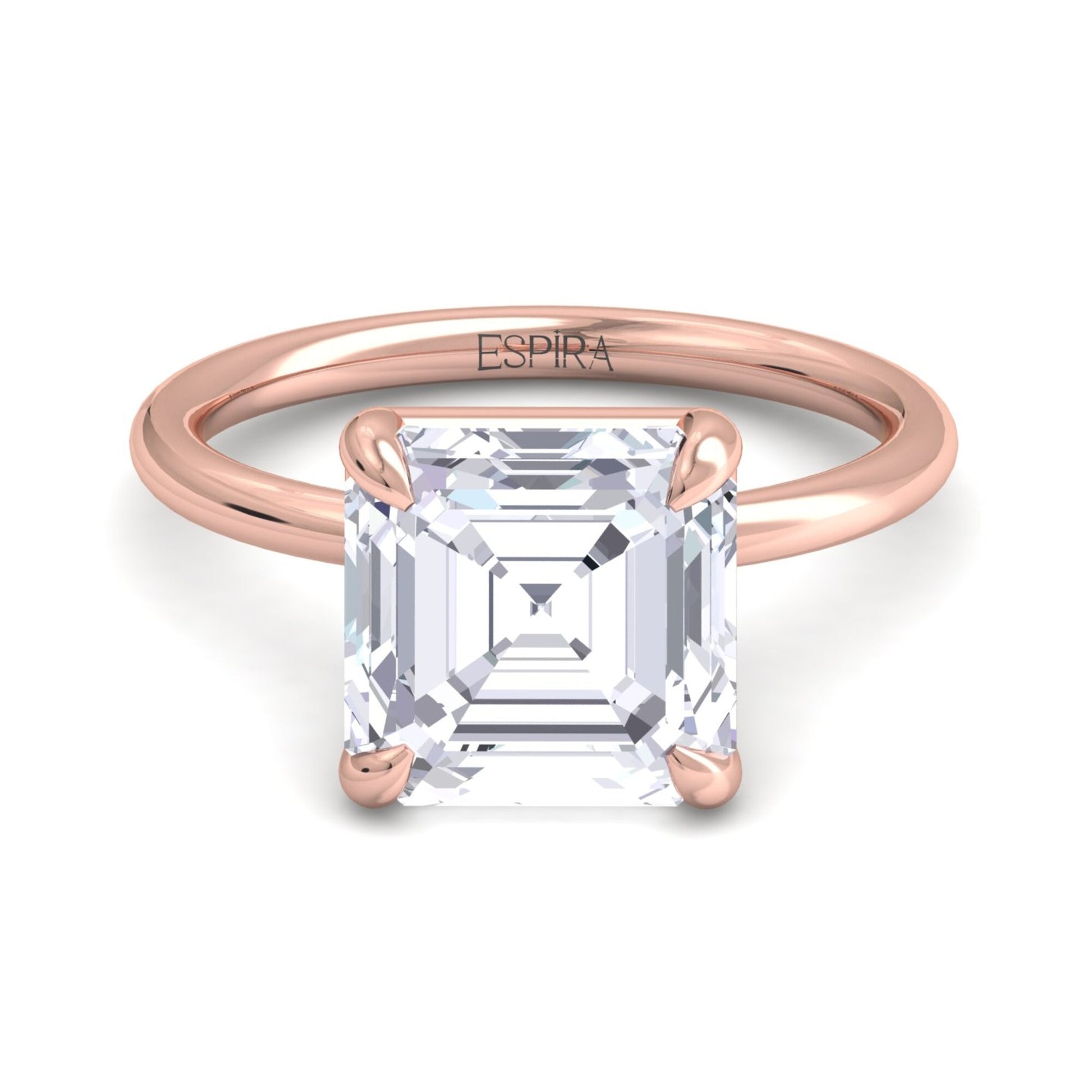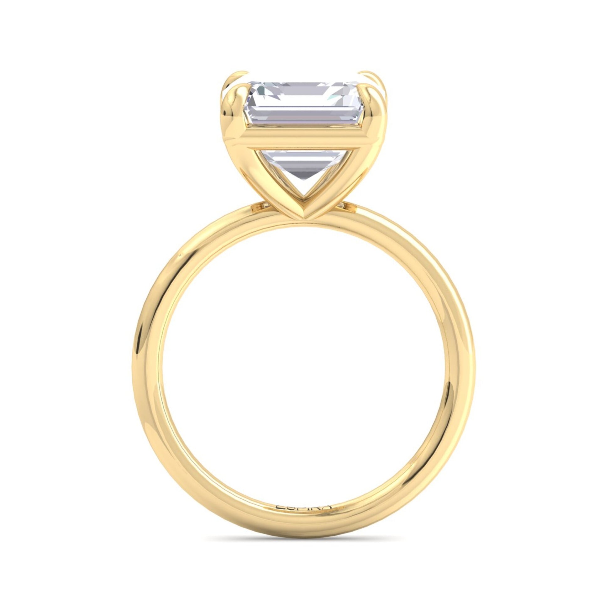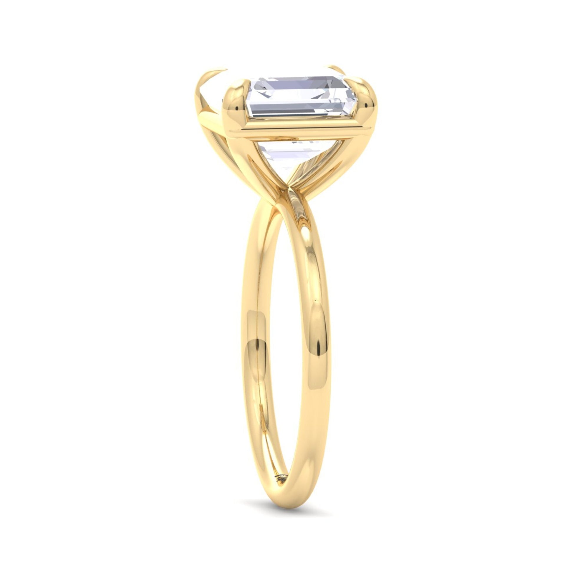 The sleek, polished gold band enhances the architectural beauty of the Asscher diamond without distraction, keeping the focus on its depth and symmetry. The open under-gallery allows light to pass through freely, enhancing the diamond’s luminous qualities from every angle and giving the ring a refined, minimalist profile.