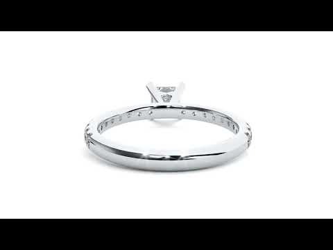 The Sunny Grace Diamond Ring features an impressive 0.97-carat ensemble of 21 diamonds. The centrepiece is a brilliant 0.57-carat princess-cut lab-grown diamond, which is held securely by a classic 4-claw prong peg head setting. Flanking the centre stone are 20 round diamonds—10 (0.02 carat) diamonds on each shoulder—weighing 0.4 carats.