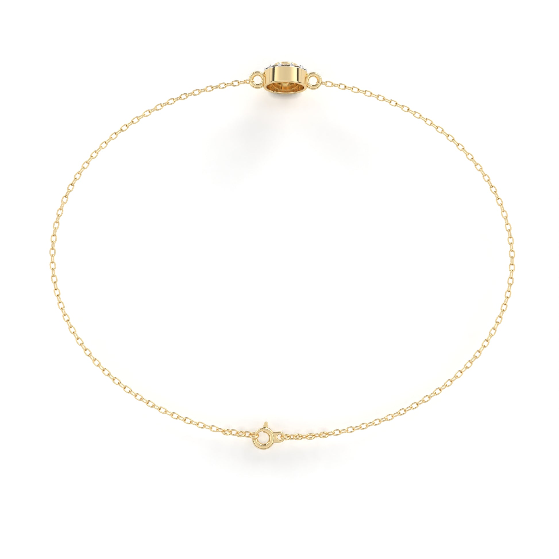 The bracelet features a 0.1-carat round-cut centre diamond secured in a protective bezel setting. This central stone is beautifully encircled by a halo of 11 accent diamonds, all meticulously set in shared white rhodium prongs. The centrepiece is connected to graceful gold hoops that lead into a fine gold chain, finished with a secure spring ring lock to ensure a perfect and comfortable fit.
