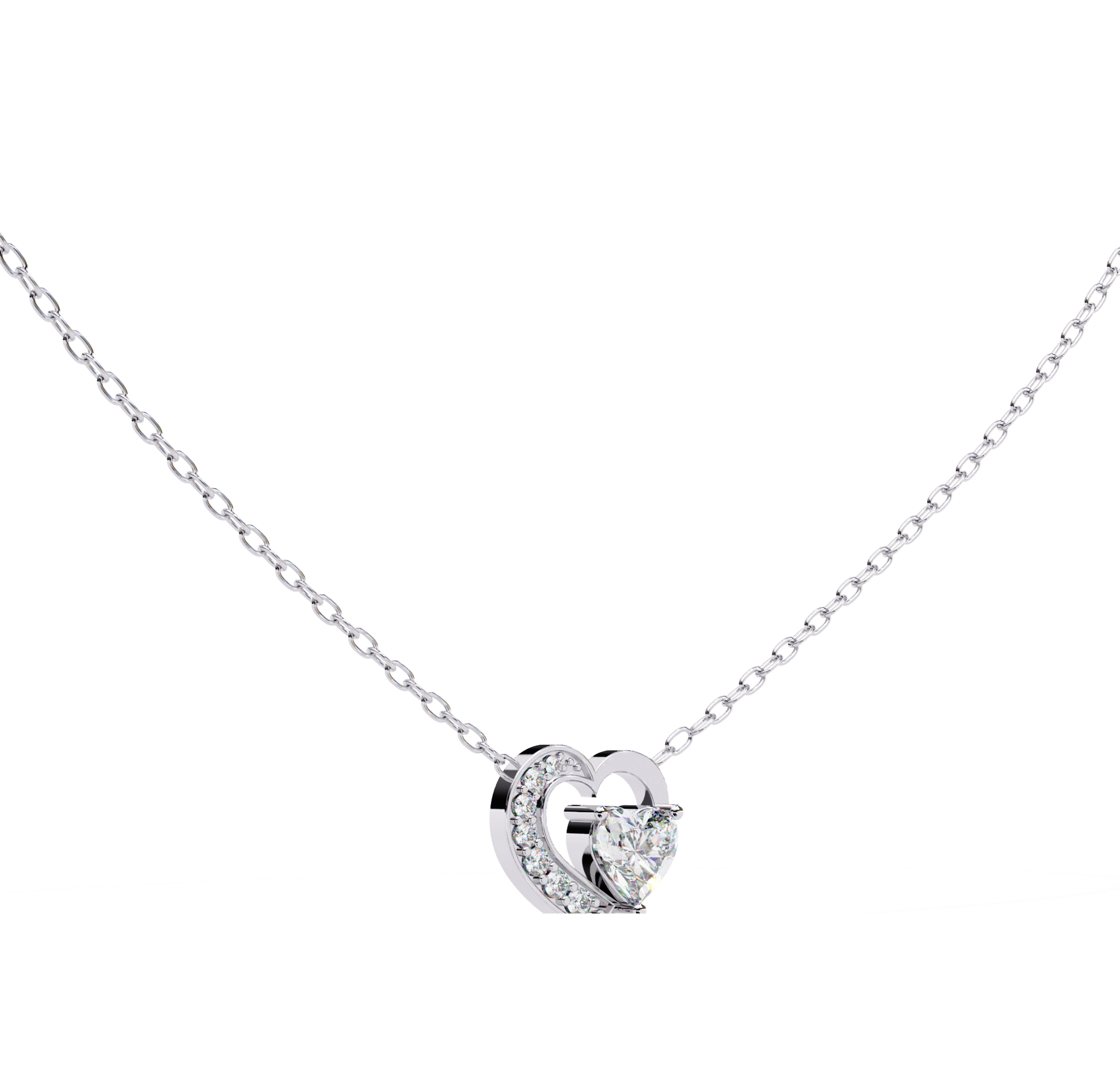 The Bound Heart Diamond Pendant is a timeless expression of love and elegance, crafted with a 0.87-carat blend of diamonds. At its core lies a stunning 0.75 ct heart-shaped lab-grown diamond, delicately secured by three prongs to showcase its brilliance and romantic form. Surrounding it is a graceful open-heart frame, part of which is adorned with six sparkling accent diamonds totalling 0.12 ct, adding a refined shimmer to the piece.