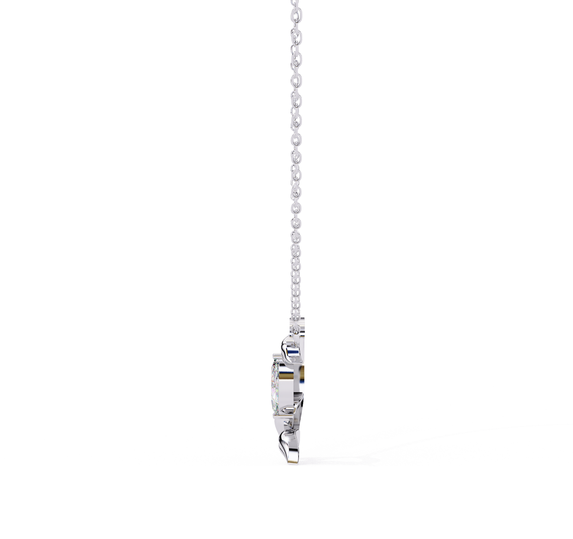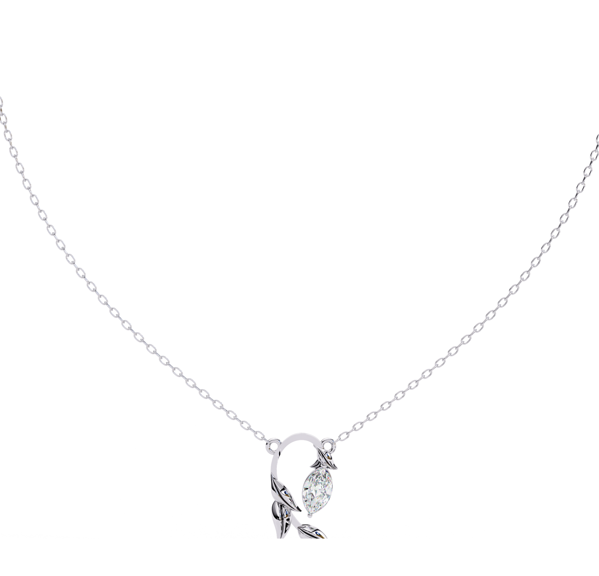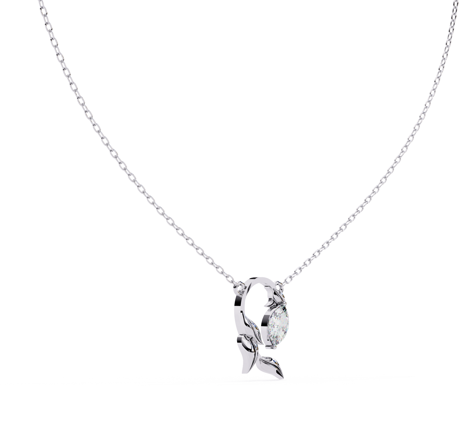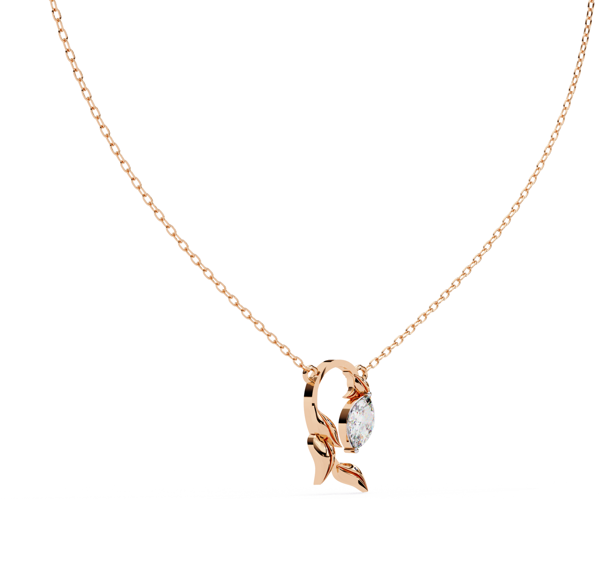 Every detail of this pendant is crafted with precision, from the delicate marquise setting to the smooth, sculptural leaves that add depth and movement. The combination of the radiant diamond and the flowing golden form ensures that the pendant catches light beautifully, offering a harmonious balance of sparkle and warmth. Its design makes it versatile enough to complement both everyday outfits and evening ensembles with equal grace.