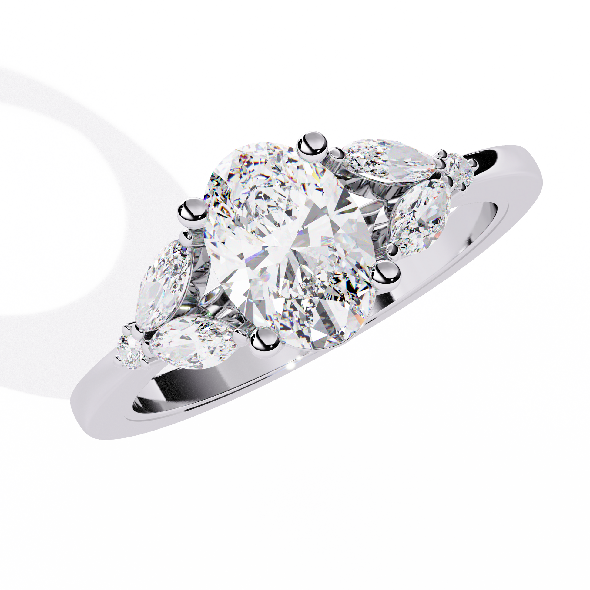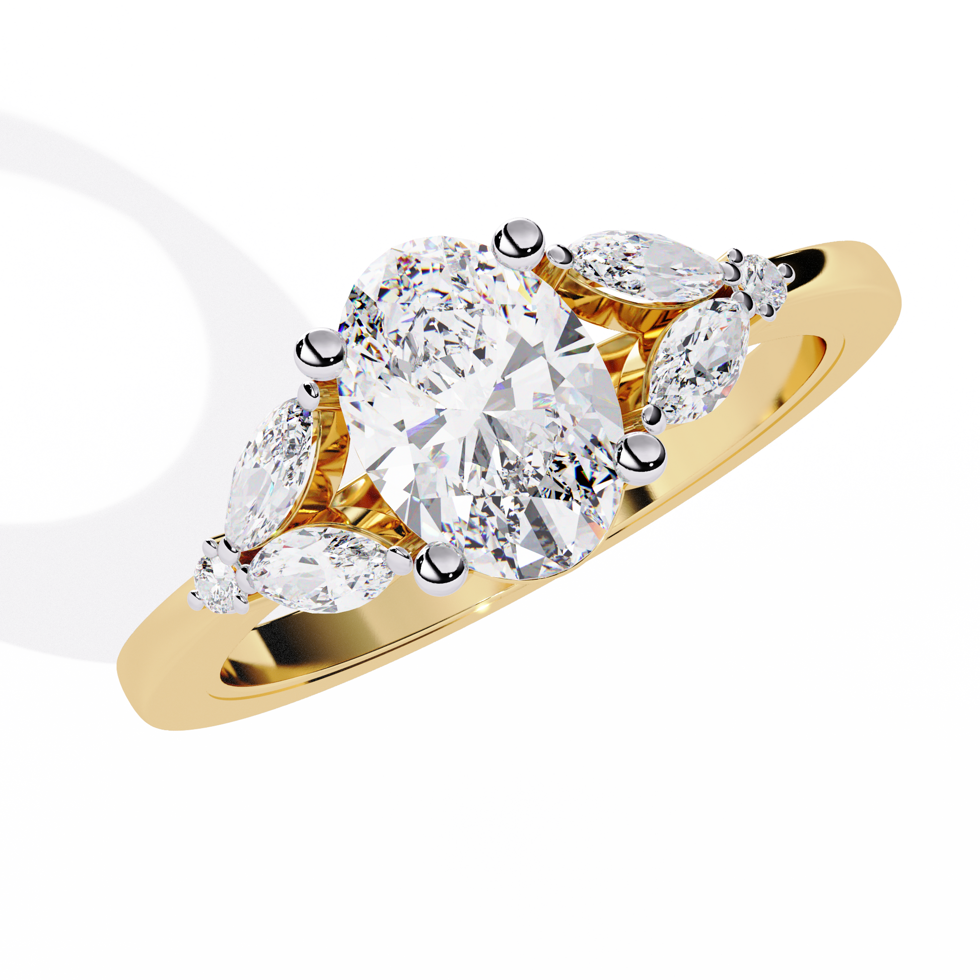 The Rich Radiance Marquise Diamond Ring is a delicate yet striking symbol, with 7 lab-grown diamonds totalling 1.36 carats. The design centres around a 1.06-carat oval-cut diamond. This brilliant centrepiece is secured with four prongs and gracefully set within a golden halo basket. The diamond shines brilliantly from the front, framed by two marquise-cut stones on either side.