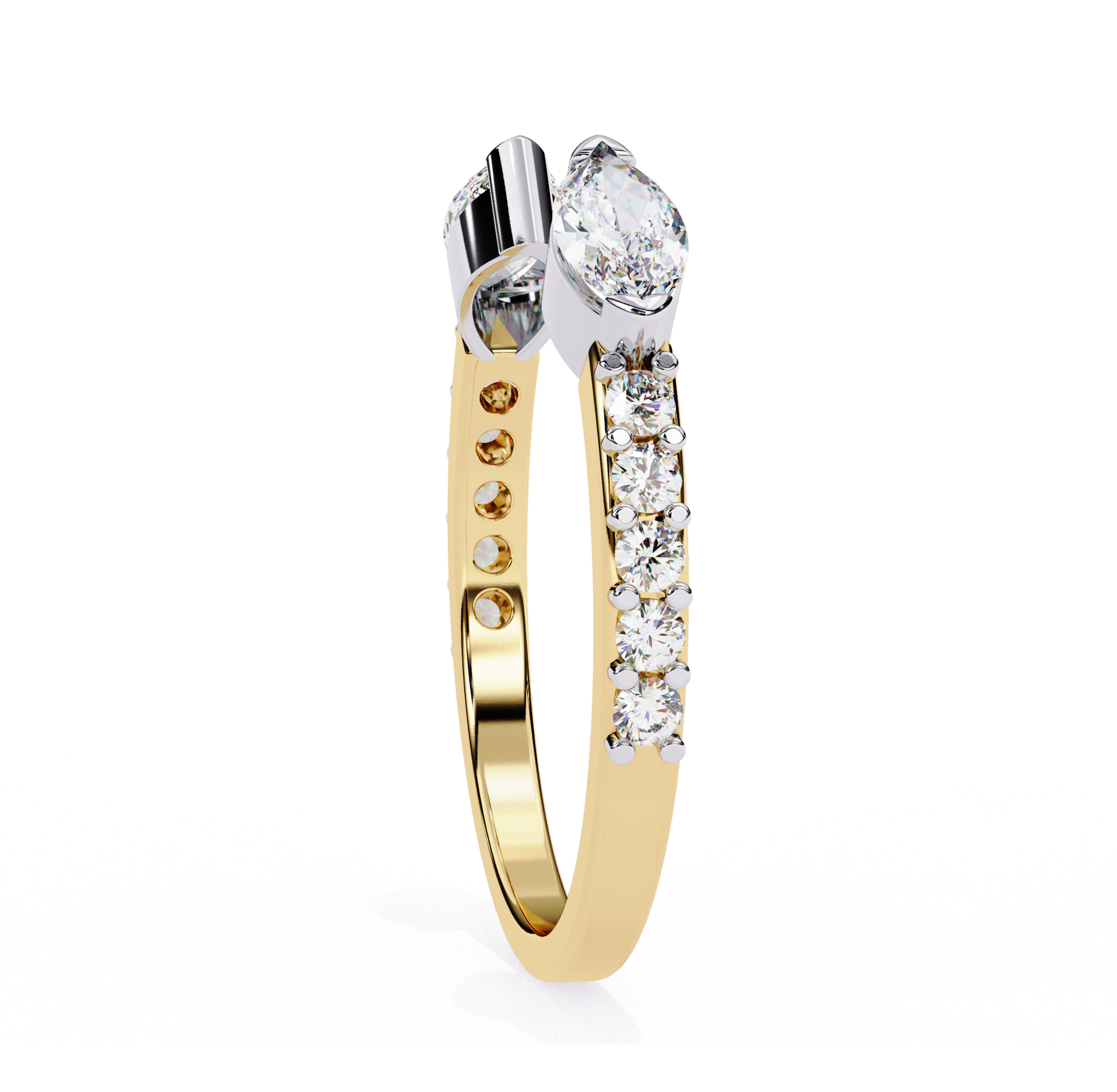 Each shoulder is lighted by 5 round diamonds, held by shared prongs; the 10 diamonds weigh 0.15 carats. Set in a sleek, contemporary band, each diamond is strategically placed to maximise brilliance while maintaining a minimalist allure. Lightweight yet luxurious, it’s perfect for stacking or wearing solo for a subtle statement of style.